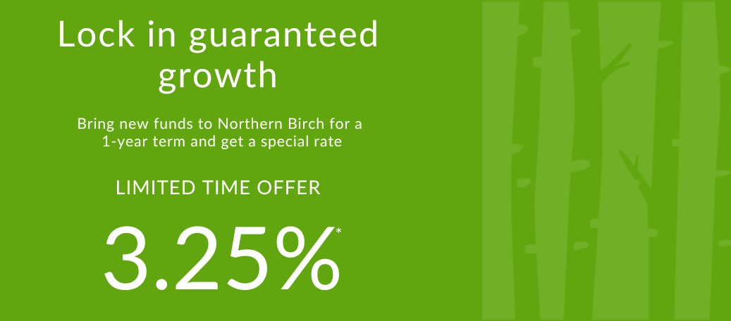 *Offer available to approved Northern Birch Credit Union members who deposit new funds into a new 1-year term deposit. Registered and non-registered products held with Northern Birch (TFSA, RRSP, RRIF, FHSA) are eligible.